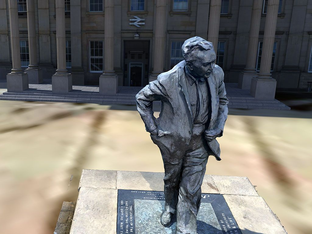 I made a photogrammetric capture of the well-known statue of Harold Wilson, situated outside Huddersfield railway station on Saint George’s Square, early in the project. Using Polycam alone, the results were satisfactory, and I decided to expand the experiment in several directions. I utilised the 3D model to create an annotated VR infographic on Sketchfab then imported it into Mozilla Hubs alongside a set of 360-degree images of the spherical capture of the square where the statue is located. Later, while experimenting with GIS data and open-source mapping, I discovered I could recreate the geographical area in three dimensions. Although the Mozilla Hubs version was lost when the platform was deprecated, I was able to create a composite environment using the statue in SketchUp.
